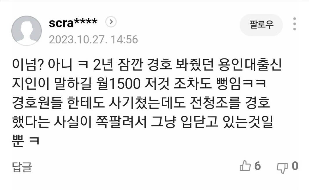 남현희에게 명품 공세를 하며 접근한 전청조는 한 달에 1500만원씩을 지급하며 경호원을 여럿 고용하여 데리고 다녔다고 하였지만 인터넷에 올라온 경호원의 지인으로 보이는 댓글에 의하면 이것조차 거짓이라고 합니다. 경호 업계에서는 고객에 대해 입을 닫는 것이 불문율이라 아직까지 별다른 제보가 없는 것이라고 하네요.