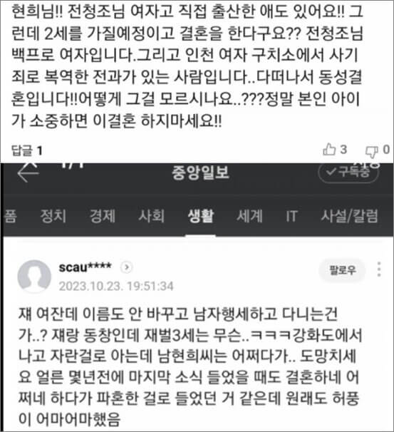 유튜브와 인스타그램에는 “강화도 출신으로 승마 선수가 아닌 태권도를 한 여성이다” “사기죄로 인천여자교도소에서 복역했고 출산 경험도 있는 것으로 안다” “조리원 동기로 만난 적 있다” “제주도에서 본인이 남성이라 밝히며 어떤 여성과 동거하고 있었는데, 어느날 사라지고 경찰들이 이런 여성을 아느냐며 탐문수사를 하러 와서 놀랐다” 등의 지인 댓글이 쏟아졌습니다.