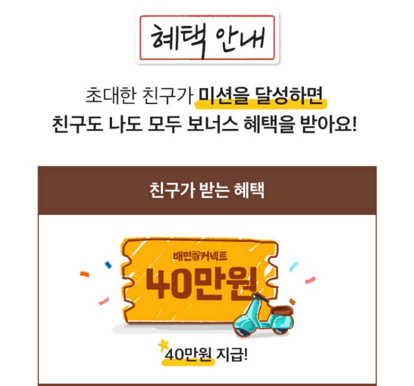 또한 현재 배민 커넥트에서는 추천인 bonus4u 입력 후 가입한 뒤 일정 건수의 배달을 수행하면 신규라이더에게 40만원을 지급하는 프로모션 행사 중입니다.